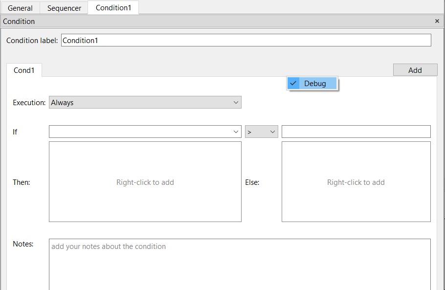 Something that I forgot to mention last time: Condition has a Debug mode that can be activated by right-clicking somewhere into the tab: