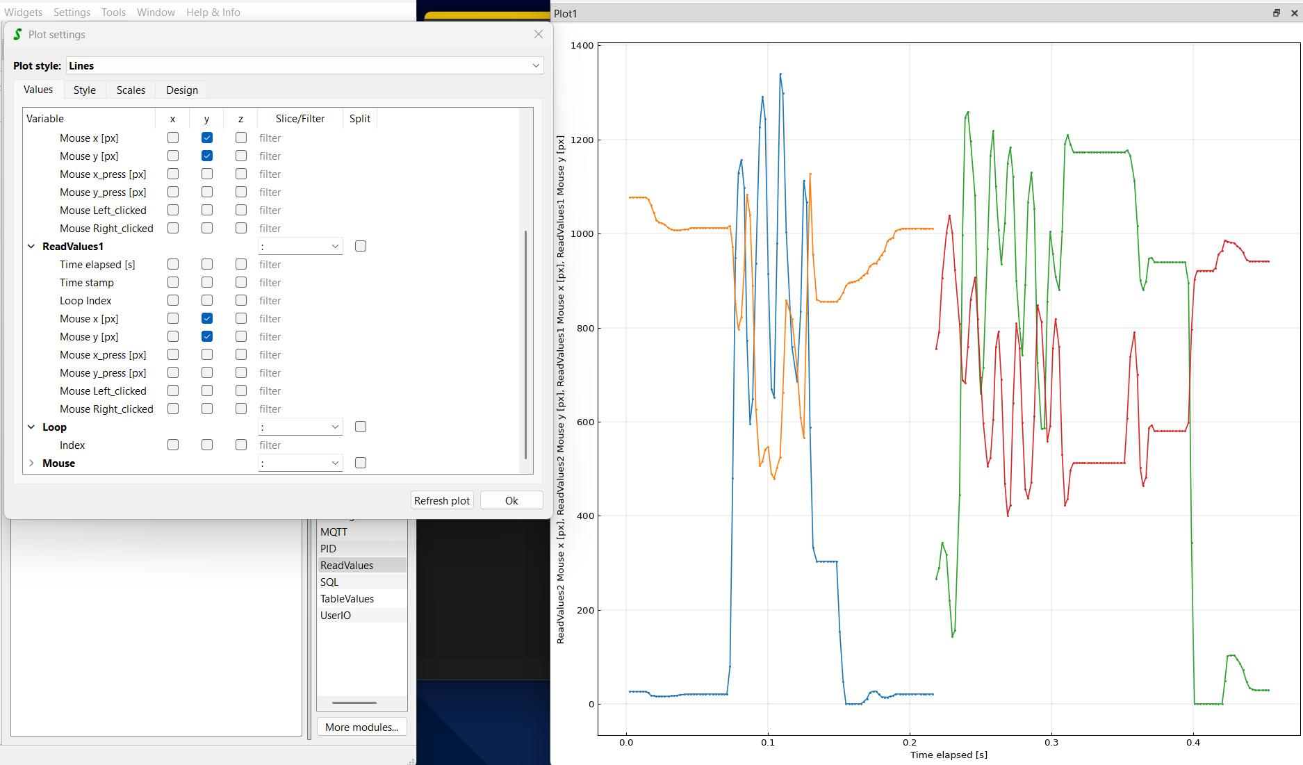 In the latest version of the ReadValues module, you can select whether you like to make a sweep over each row/line of the file or readin the data as a list for each variable. In both cases you can plot the data afterwards. It only makes a difference when you like to post-process the data.