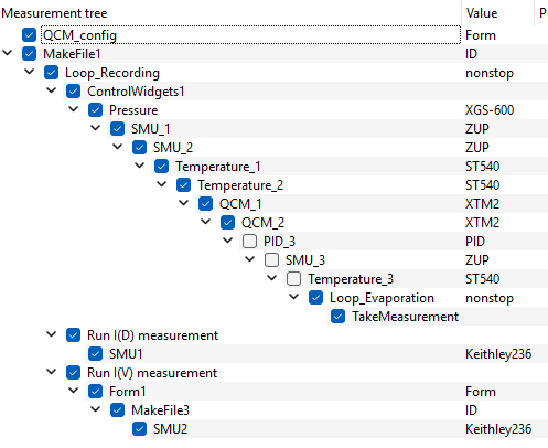 It also means that the three branches should only differ in those modules that have to change between the branches. For example, SMU_1 and SMU_2 that are probably used to track current during the evaporation should be very much at the end of the main evaporation control branch, while Pressure, QCMs, Temperature can be part of all three branches.