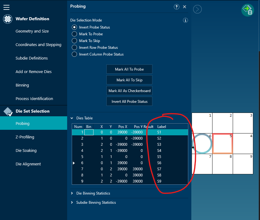 Please note that the values from the die table are also used internally to select the next die during a sweep. If you add labels to the die name purely for display purposes, make sure to remove or strip them again before triggering the move to the next die. Otherwise, the prober may raise an error if the die coordinates contain unexpected additional information.